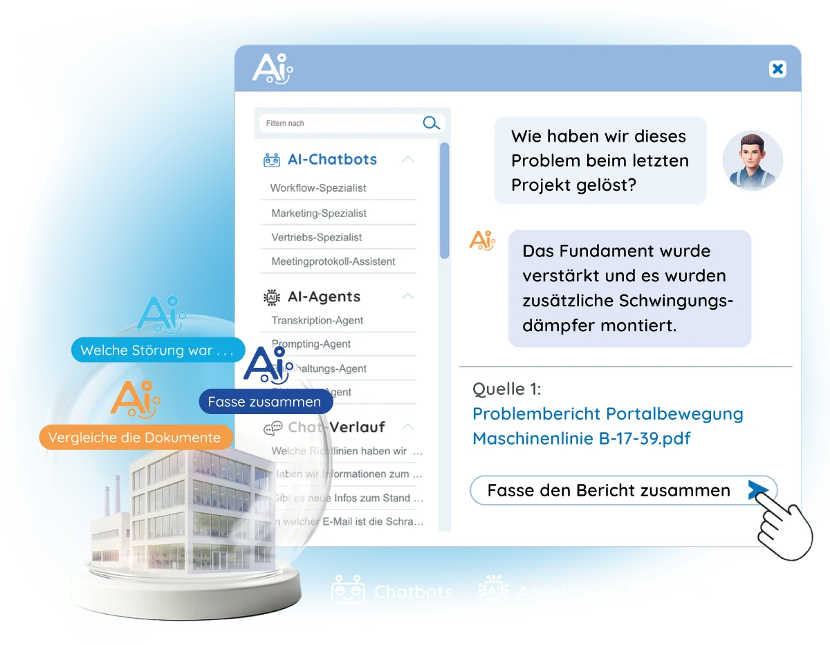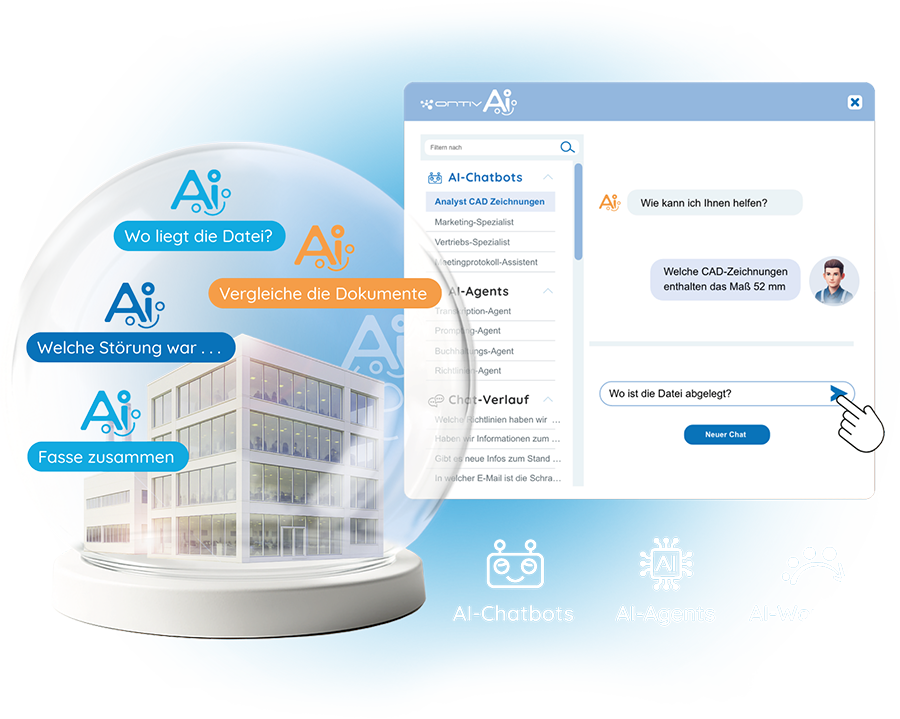 Die ONTIV AI zentralisiert Ihr internes Unternehmenswissen, kennt Zusammenhänge in Ihren Vorgängen und Projekten und listet zuverlässig gesuchte Dateien und deren Quellen. Die vollkommen firmeninterne KI unterstützt Sie dabei, schnelle Lösungswege zu finden und vorhandenes Firmenwissen blitzschnell aufzuspüren, ohne zeitintensive Suche!
