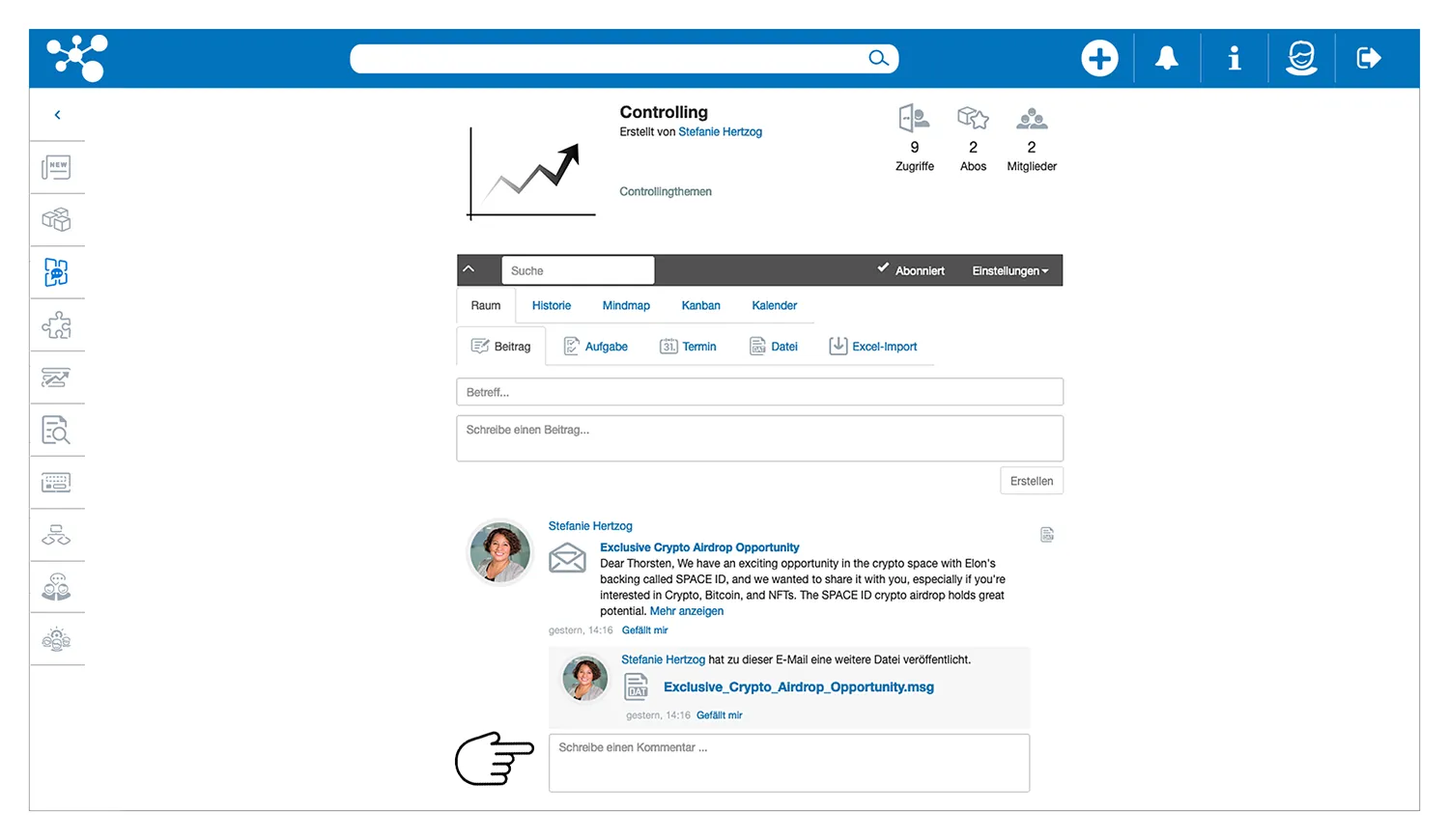 Kommentare können Sie beispielsweise zu jeder Aufgabe, Maßnahme, Datei, zu Beiträgen, Terminen, E-Mails oder auch geplanten Meetings abgeben.